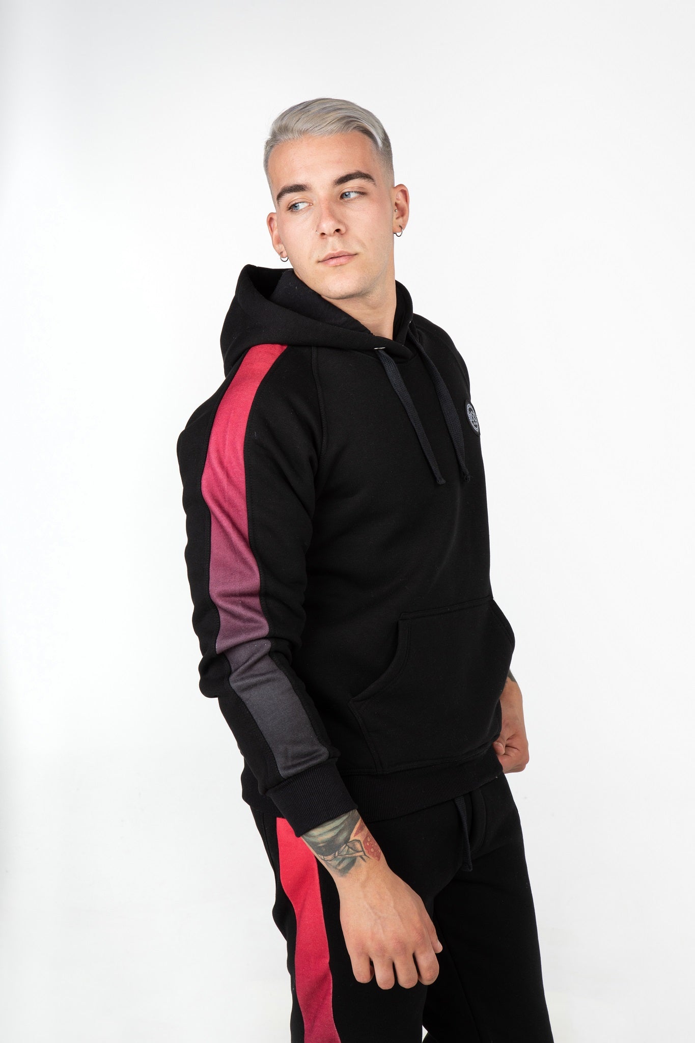 Το μαύρο φούτερ έχει κόκκινη γραμμή στα πλαϊνά